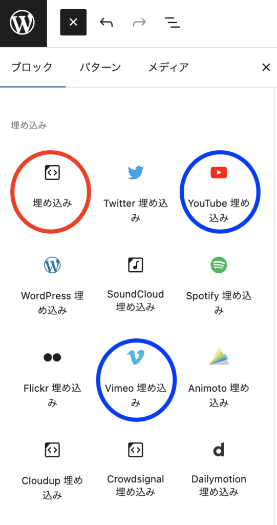 動画を埋め込みたい場所で埋め込みブロックを選択して、赤枠の「埋め込み」を選択します(例:青枠のように使用する動画サービスの専用ブロックが表示されていればそちらを選択しても問題ありません)