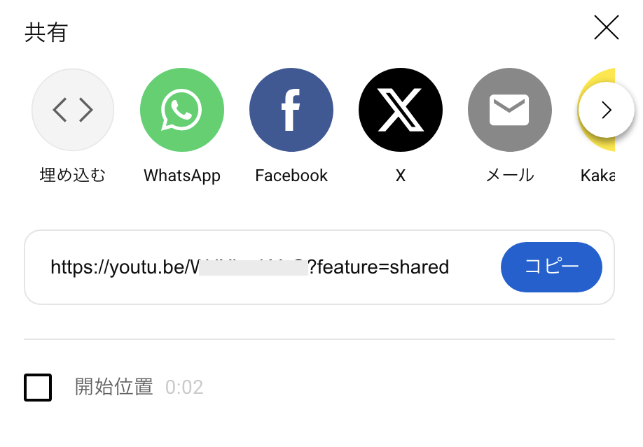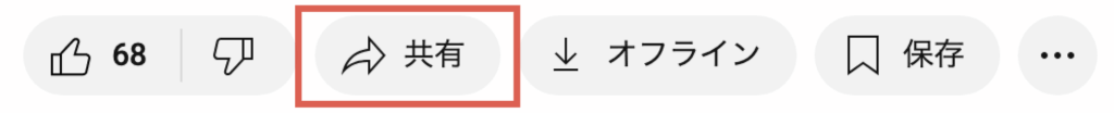 埋め込みたい動画のURLを動作サイトからコピーします。Youtubeの場合、動画画面の右下(スマホの場合は、右下の3点メニュー内)にある「共有」からURLをコピーしておきます。