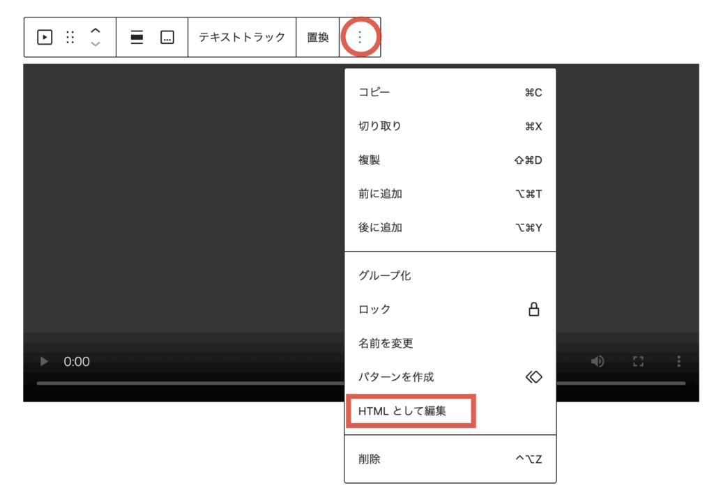 動画ブロックを「HTMLとして編集」にして、videoタグにpreload="none" を設定します。