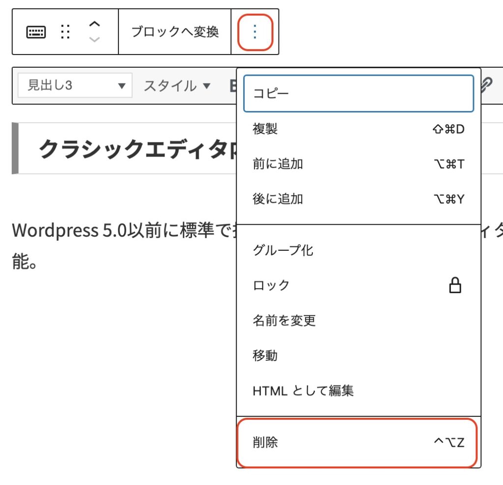 また、不要なブロックを削除したいときは、一番右の3点マークをクリックすると一番下に「削除」が表示されるのでここから削除できます。