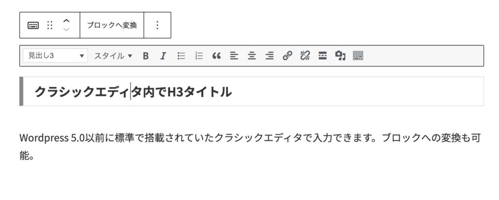 Classicブロックを選択すると、WordPress 5.0以前に標準で搭載されていたクラシックエディタで入力できます。ブロックへの変換も可能です。